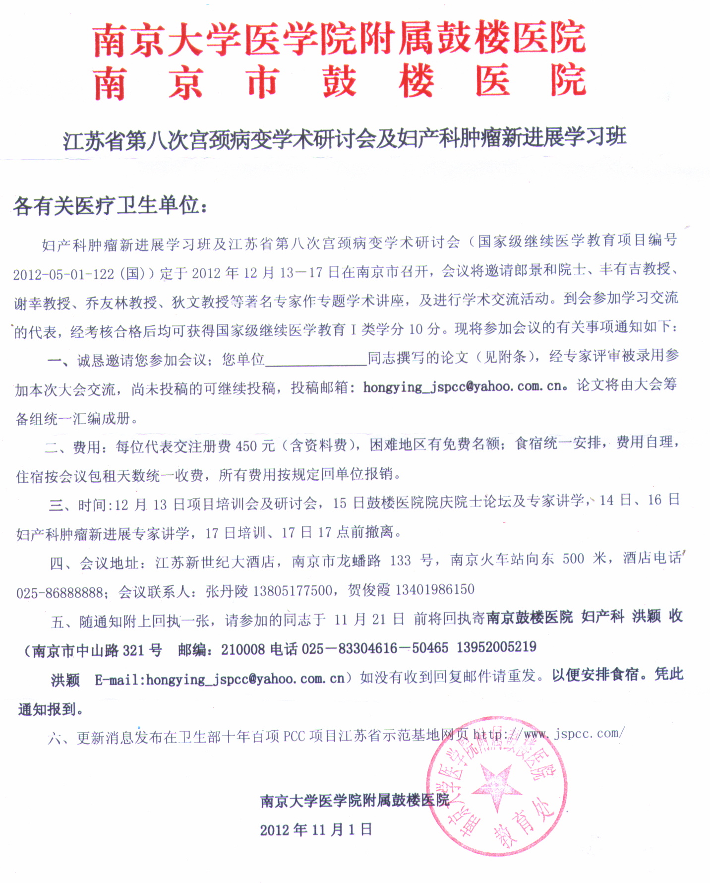 五、随通知附上回执一张,请参加的同志于 11月21日 前将回执寄南京鼓楼医院妇产科 洪颖 收(南京市中山路321号 邮编:210008电话025-83304616-50465 13952005219