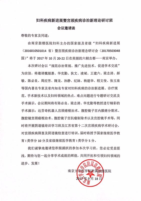 由南京鼓楼医院妇科主办的国家级及省级“妇科疾病新进展(2016010501014省)暨宫颈疾病诊治新理念研讨会(20170503048国)”将于2017年10月20-22日在美丽的六朝古都——南京举办。
